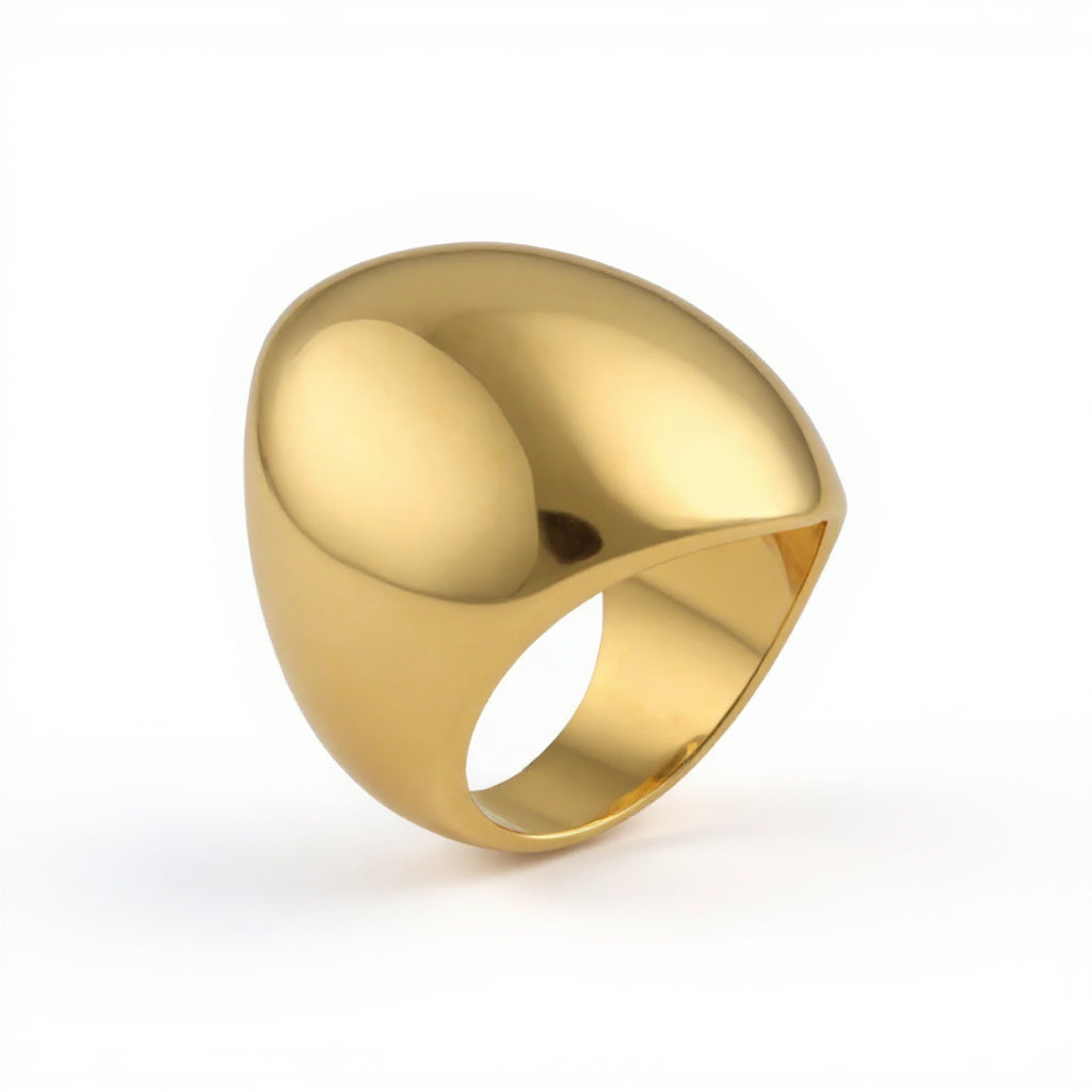 Erado Ring aus vergoldetem Edelstahl mit einem breiten, massiven Design. Die Front des Rings ist geschwungen und wölbt sich leicht nach außen, wodurch er eine markante, runde Form erhält. Der Ring hat eine glänzende, polierte Oberfläche und misst etwa 3,5 cm in der Länge und 2,3 cm in der Breite.
